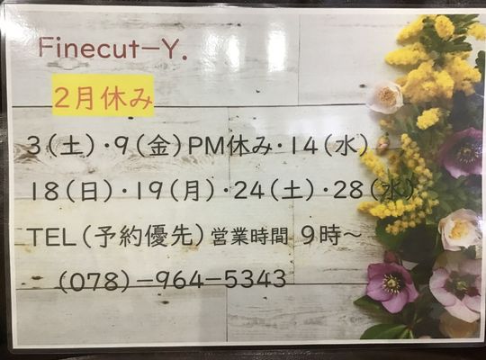 2024/01/15おはようございます!明石の美容室 Fine cut-Y.です☆ まことに勝手ながら、2024年2月休みを 3(土)・14(水)・18(日)・19(月)・ 24(土)・28(水)・9... -